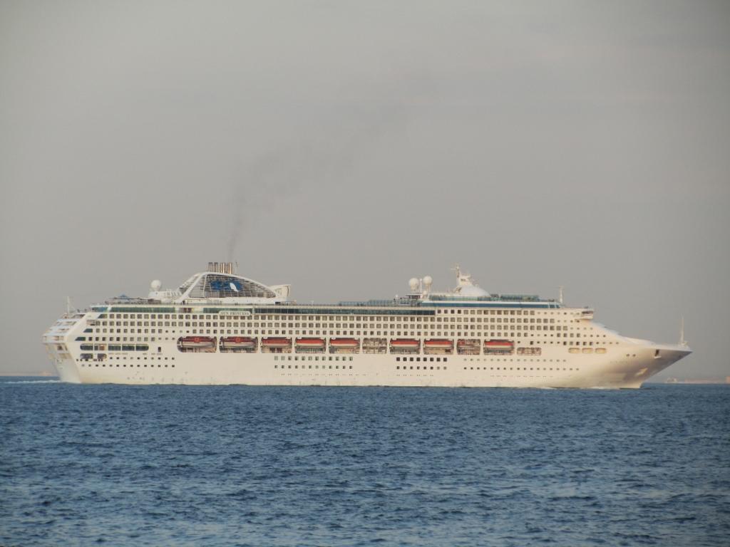 プリンセスクルージズ (Princess Cruises Inc.) 運航。 Built: 1995, IMO: 9000259, MMSI: 310438000 Gross tonnage: 77,499t, Length: 261.0m, Beams: 32.0m |