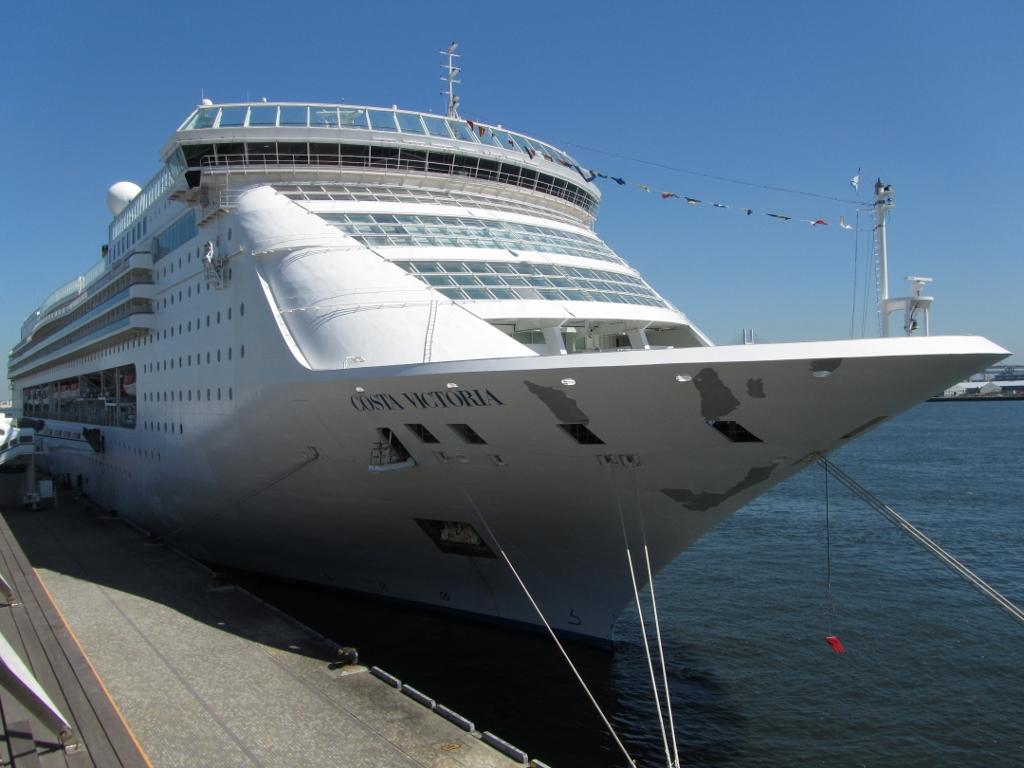 横浜港に着岸中の「コスタビクトリア」です。前日の台風の影響か船首のペンキが派手にはげていました。なかなかお化粧直しはしないのでしょうか?せっかくの優美な船体がもったいないところです。 |