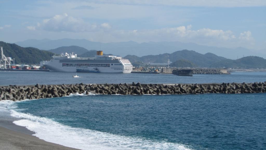 桂浜海岸からみた「コスタビクトリア」です。高知新港には客船の写真をとる場所がないなあと思っていましたが、なんと桂浜からドンピシャで見えるんですね。それにしても高知は海も山もきれいですね。 |