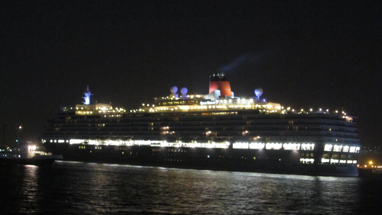 2330という深夜にもかかわらず大勢の見物客でにぎわっていました。それにしてもQEは巨大でした。ダイヤモンドプリンセスよりもう一回り大きく感じられました。 |