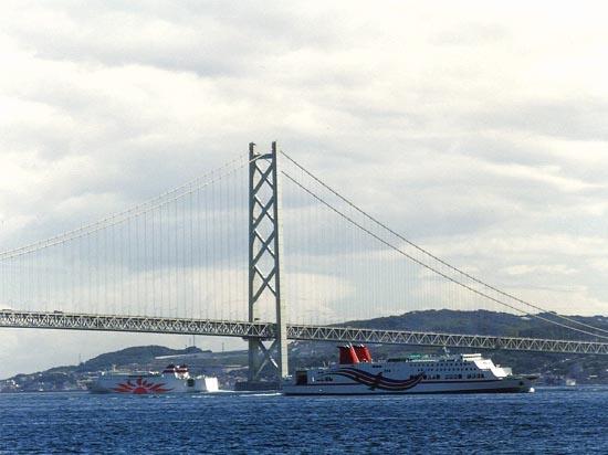 明石海峡大橋を通過する「おれんじ8」、左は「SFあいぼり」 |