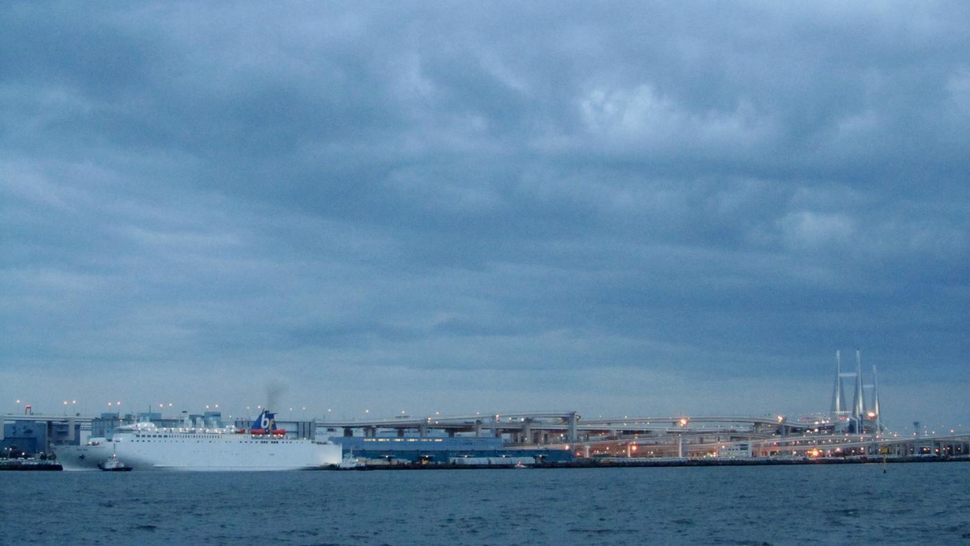青島から上海経由で(?)に横浜に寄港しました。ベイブリッジが右側に見えています。 |