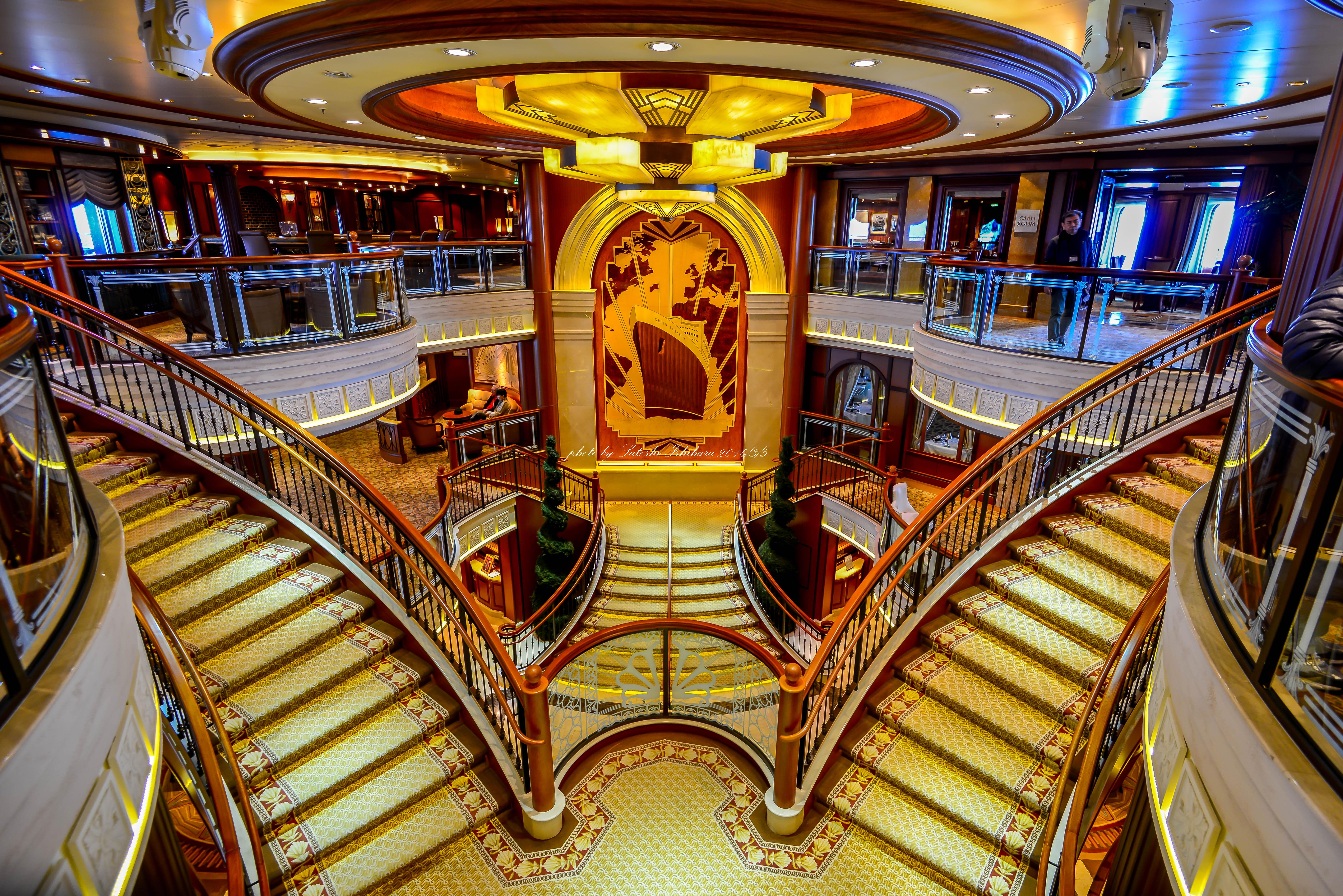グランド・ロビーは3層吹き抜けの壮大な空間です。 ひときわ目を惹くのが初代クイーン・エリザベス号を模した寄木細工の壁画。 作者はエリザベス2世の甥、リンリー子爵です。 |