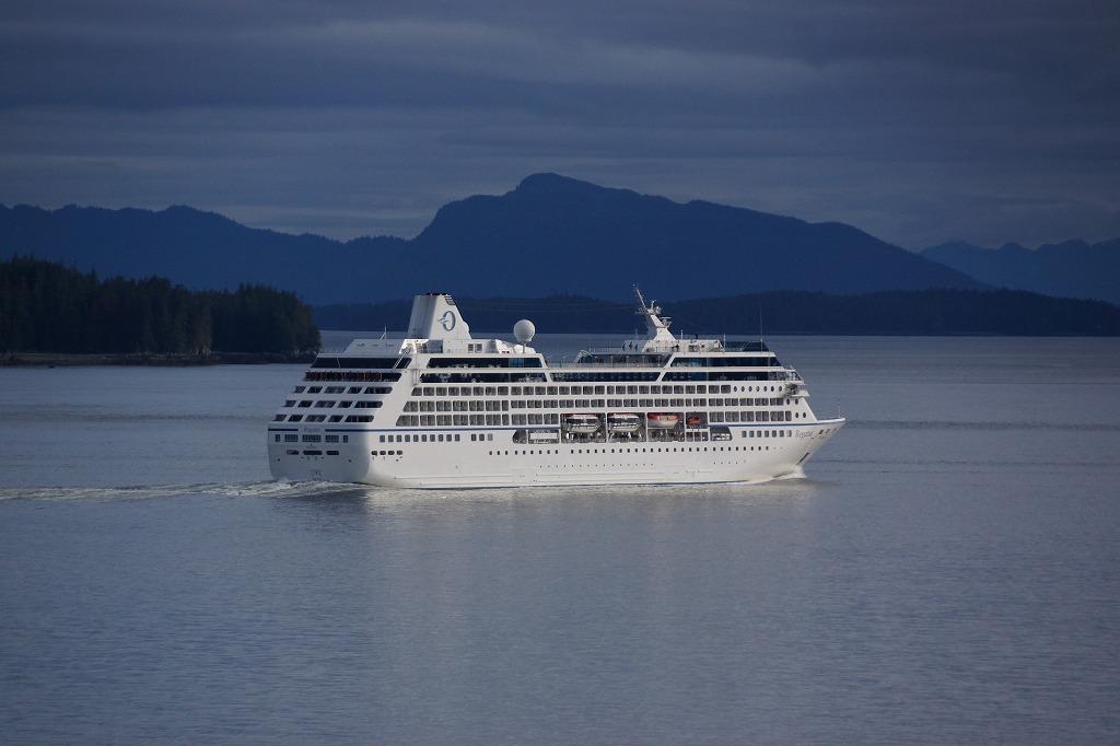 アラスカクルーズの2日目インサイドパッセージの海峡で |