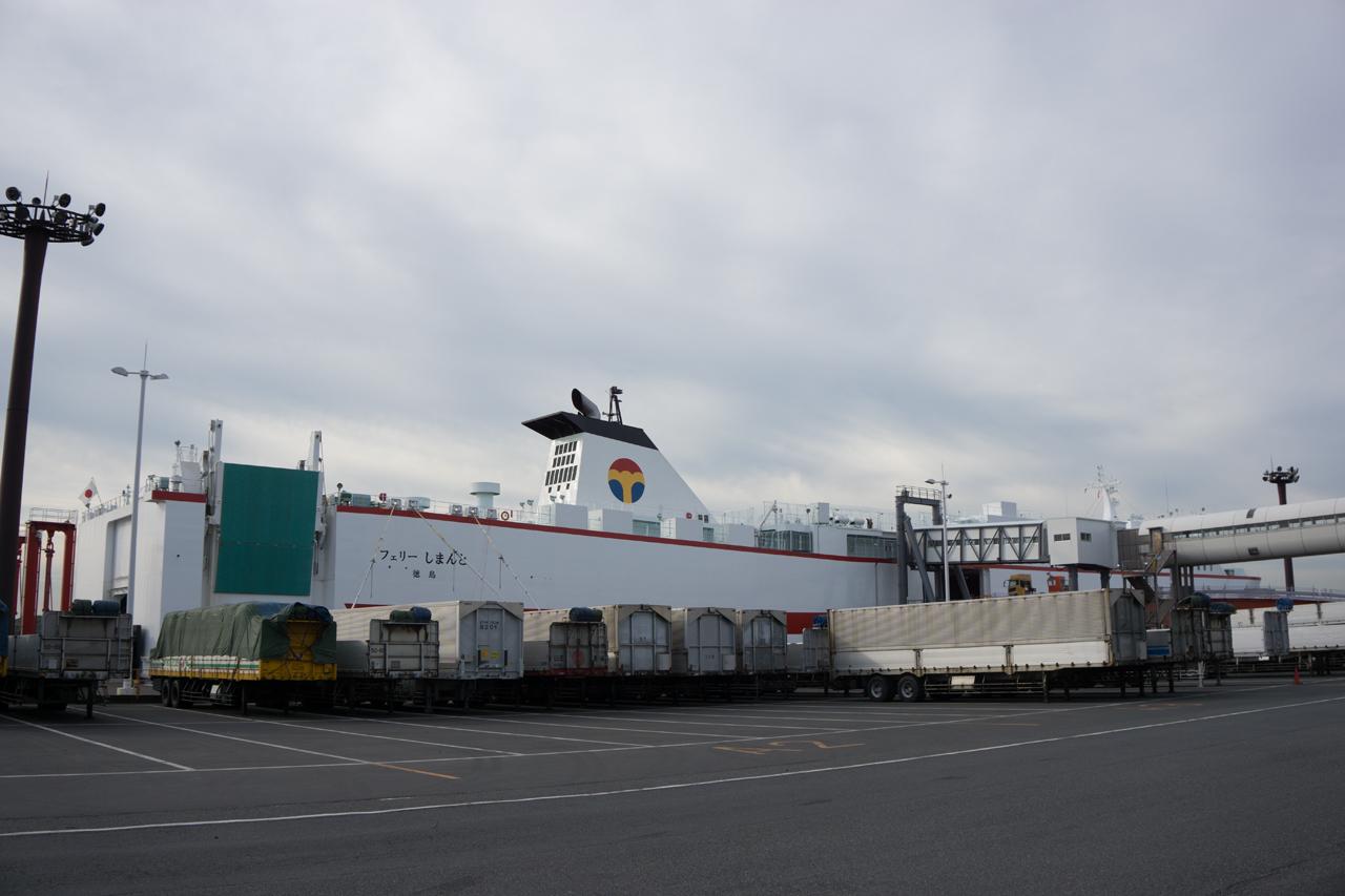 東京港に到着した「フェリーしまんと」です。荷役のトラックが忙しく走り回っていました。 |