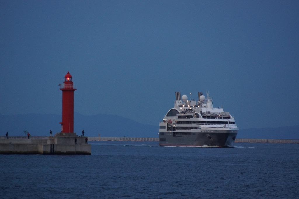 いいですね。これは朝何時頃に撮影されたのでしょうか。朝闇の中を美しい客船の灯が少しずつ近づいてくるのを見るのもいいですね。いつも投稿ありがとうございます。