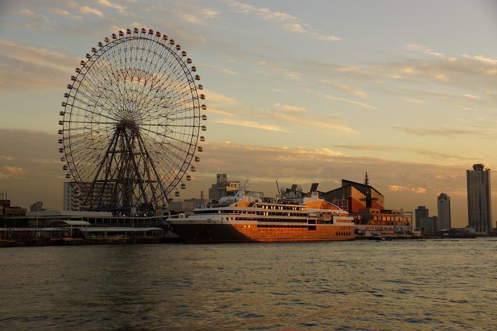 大阪港天保山岸壁に停泊中、夕陽に輝く姿が撮れました |