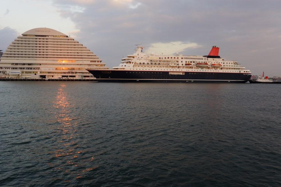 にっぽん丸の接岸時に、夕陽がビルの窓に反射する表情を重ねてみました |