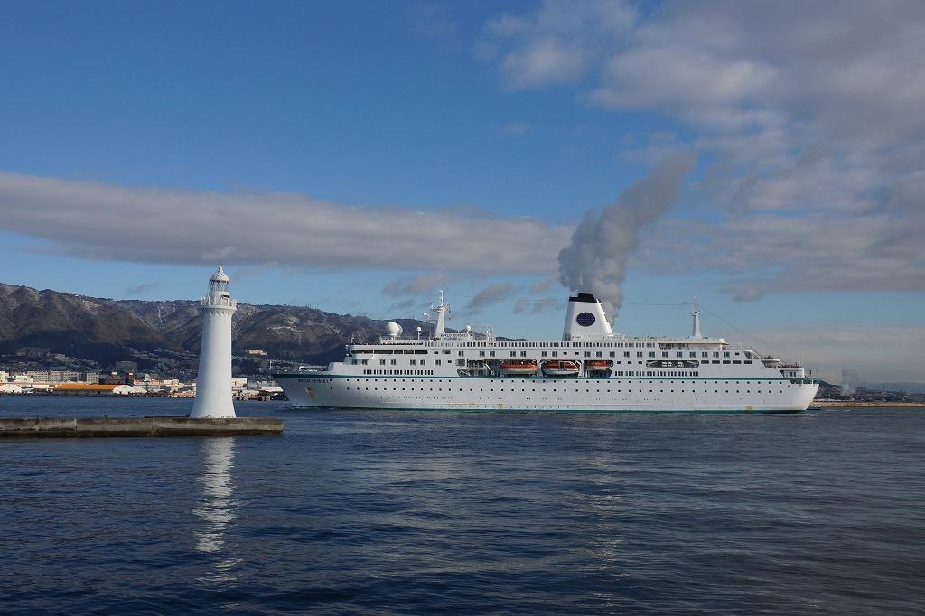 雪景色の六甲山を背に、神戸港北埠頭を回って入港! |