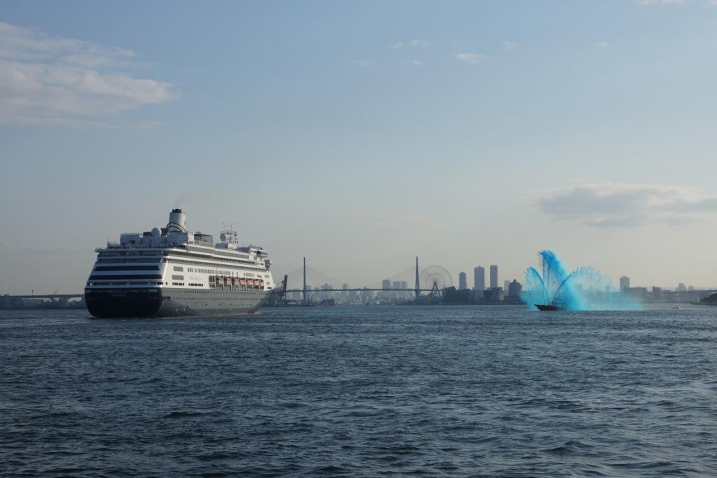 これは見事なショットですね。大阪港の観覧車と立派な橋もすべて入っていて見事です。青い色の放水も貴重なシーンですね。乗客にも喜ばれたことでしょう。