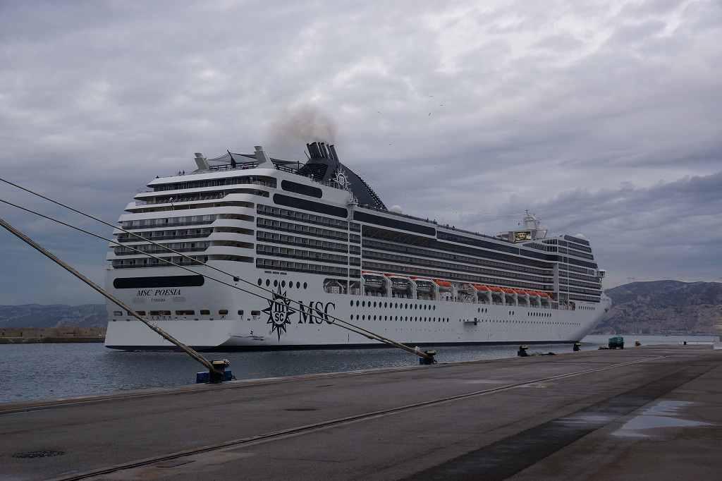 マルセイユ港でゆっくり後進、まもなく接岸 |