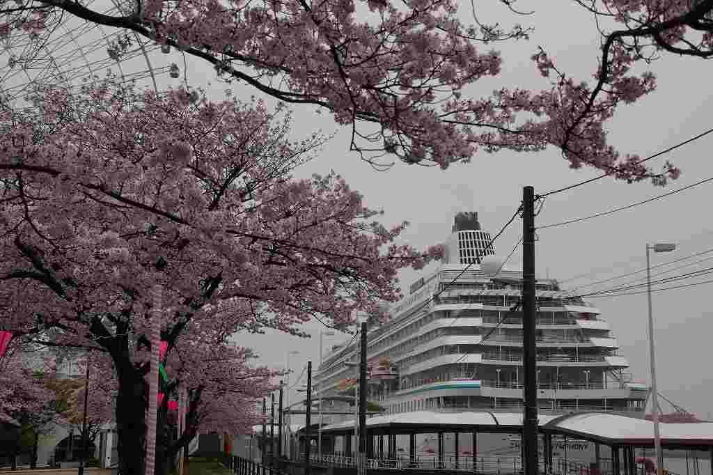 4月11日撮影 天保山岸壁に隣接する天保山公園の桜が入港に合わせるように満開を迎えていました。 |