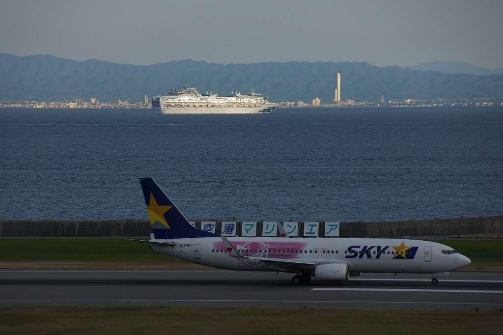 5月27日撮影 神戸港を出港して大阪湾を南下中、ちょうど神戸空港を離陸滑走するスカイマーク機と重ねて撮れました。 |