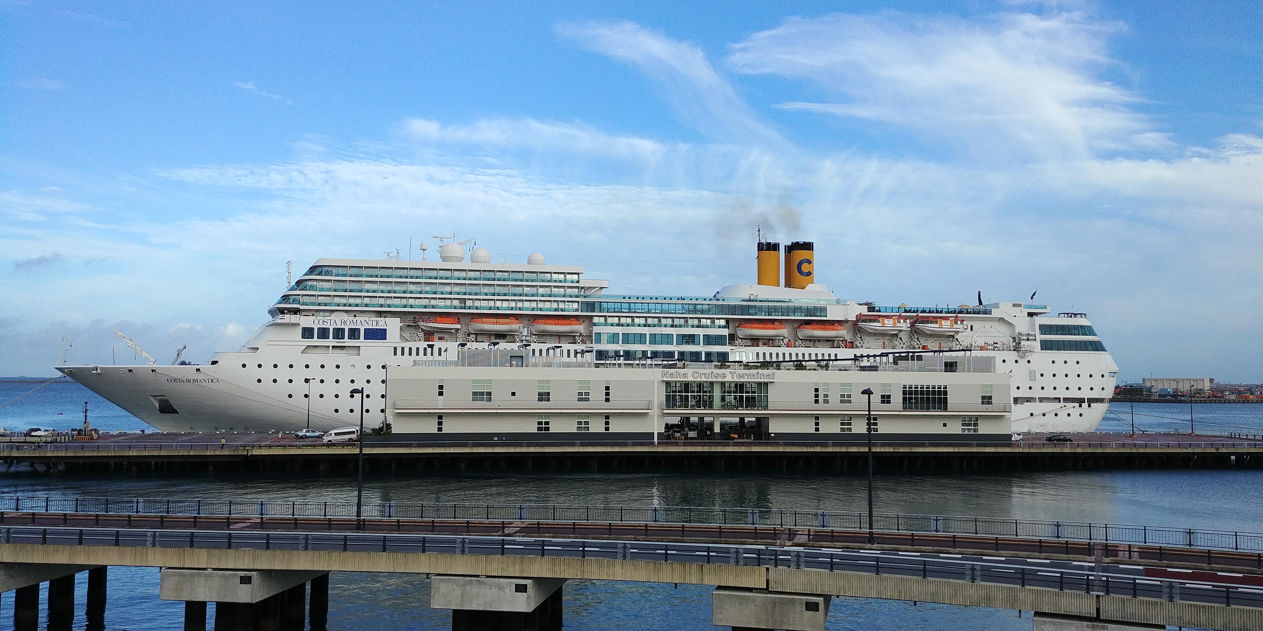 那覇港のクルーズターミナルに停泊しているコスタネオロマンチカです。那覇の繁華街までも歩ける距離なので非常に便利な場所に着岸します。 |