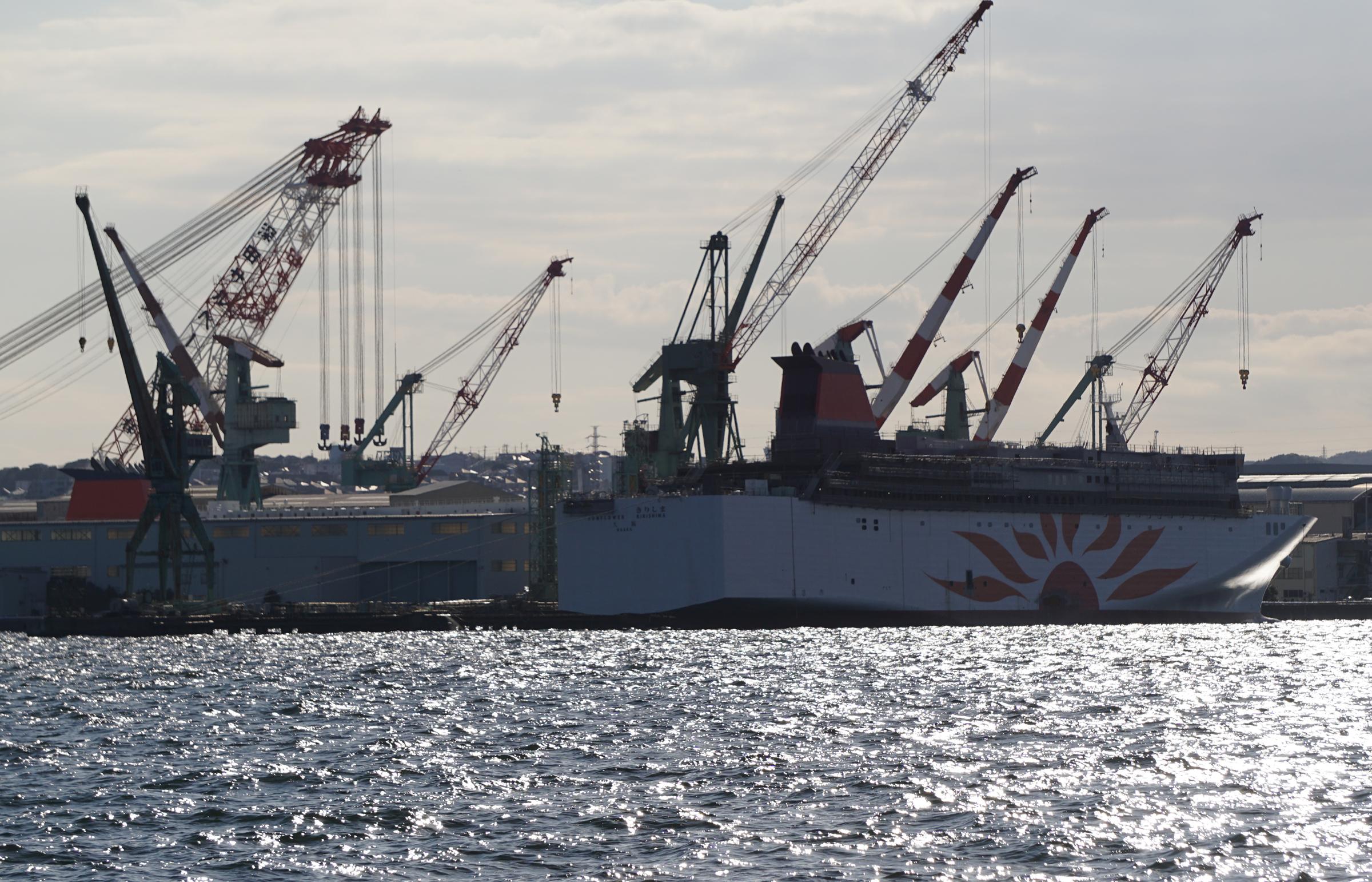 JMU磯子工場で艤装中のシーンです。背後の修繕ドックには少し前に竣工した「さんふらわあさっぽろ」が機関調整のために入渠しておりファンネルが見えます。 |