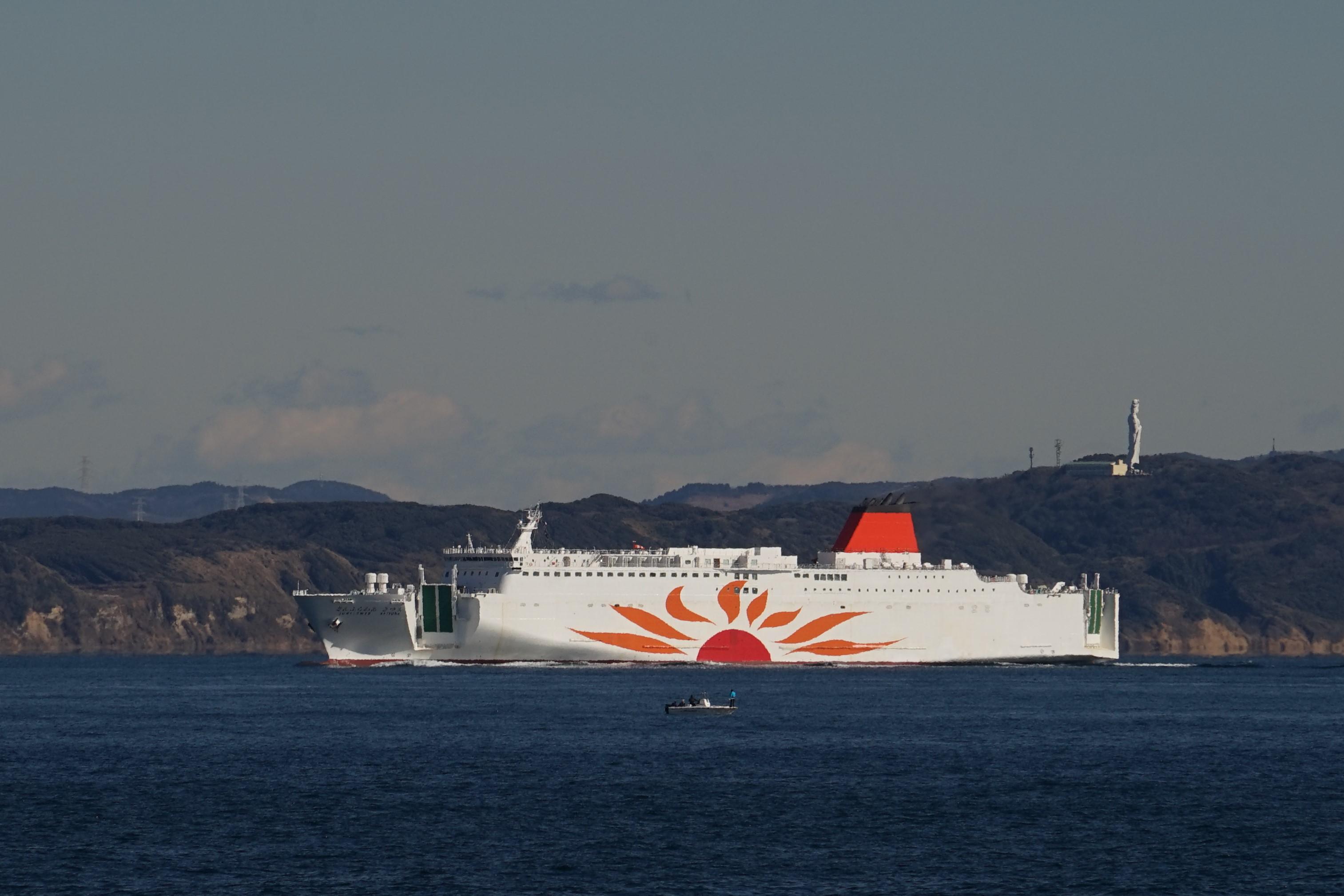 浦賀水道まで行かれたのですね。私も見に行きたかったのでうらやましいです。そしてまた美しい写真を投稿頂き感謝です。先に就航した姉妹船2船は推進機構等のトラブルで大変そうでしたが、本船は無事に就航できるといいですね・・・。船首のカーブとアンカーの位置がさんふらわあ7を思わせるのは私だけでしょうか。
