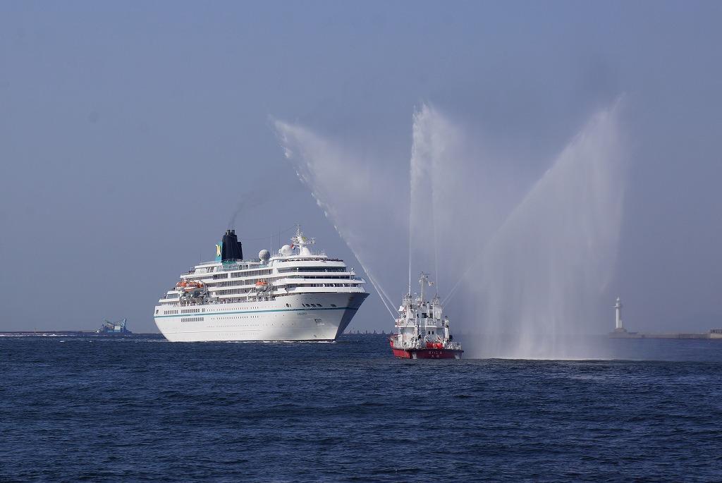 2月20日撮影 7年ぶりを祝っているような青空が広がって、入港歓迎放水も際立って見えました。 新造客船と違った本来の客船らしい姿にウットリです。 |