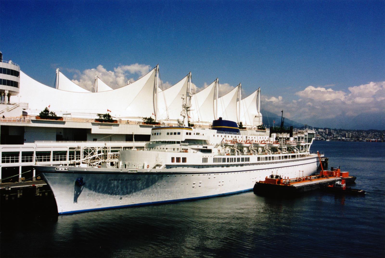 カナダプレイスに着岸中の「ユニバースエキスプローラ」です。天気も良く美しい白い船体が輝いていました。 |