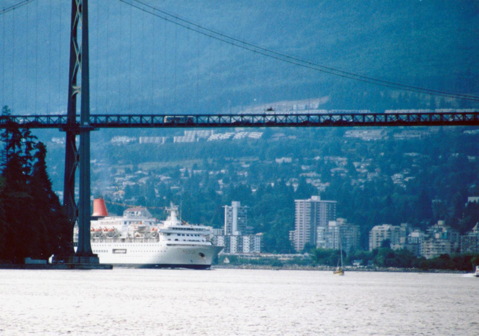 ライオンズゲートブリッジ越しに現れた「にっぽん丸」です。 |