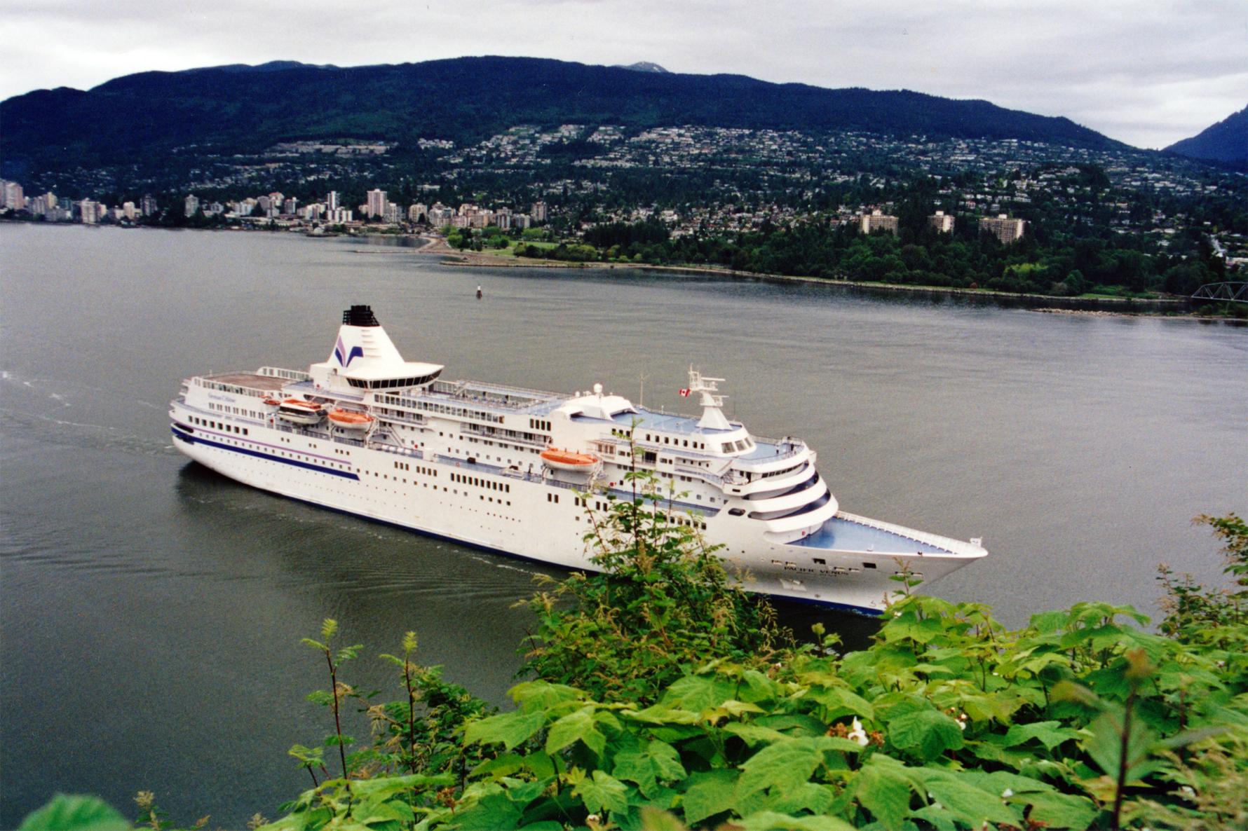 VancouverのBurrard Inletの入り口あたりにはProspect Pointという小高い丘があり、Lions Gate Bridgeをくぐり、Vancouver Portに入出港する客船たちを眺めることのできる場所があります。日本からはるばるやってきた「ぱしふぃっくびいなす」をここから撮影しました。 https://goo.gl/...51p9FVKuM2 |