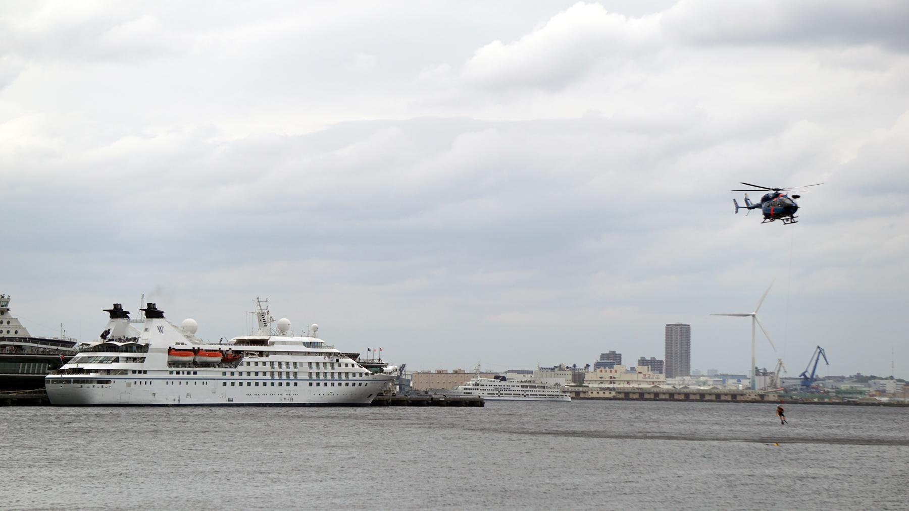 スターレジェンドとミレニアムの着岸した大桟橋横の山下公園海上で海上保安庁の海難レスキューヘリのデモを行っていました。 |
