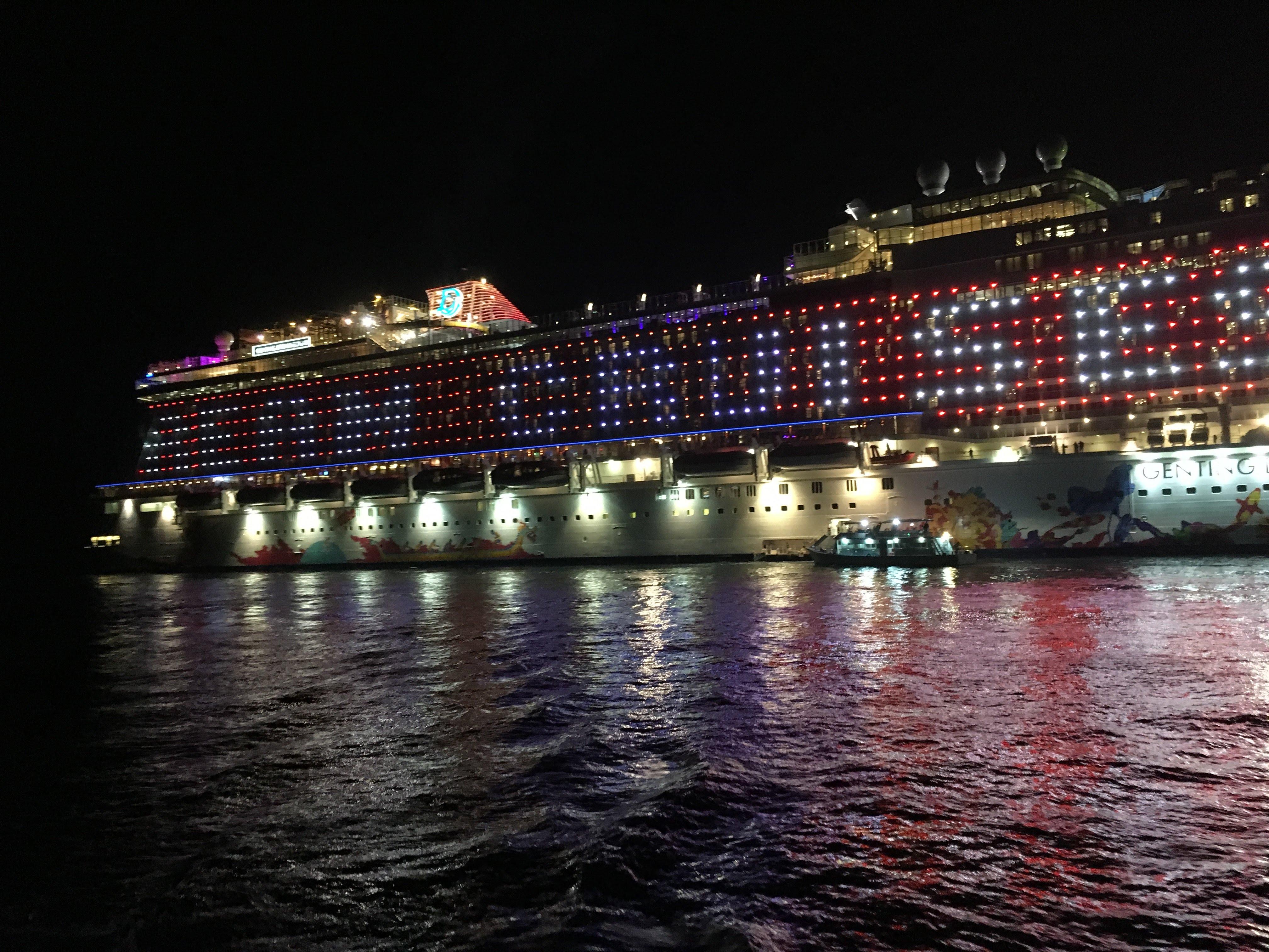 テンダーボート上陸中に撮りました。ネオンが変わります。アジア的は派手なネオンです。 |