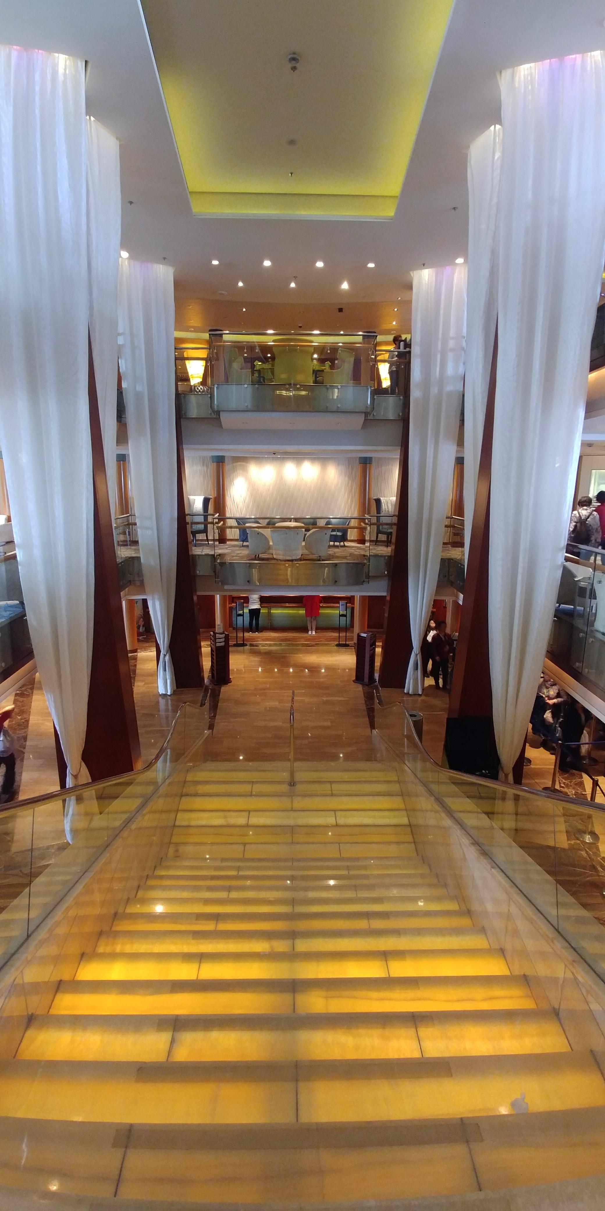 この3層吹き抜けのGrand Foyerと呼ばれるメインロビーがCelebrity Millenniumの顔となっており、Guest Relationsやコンシェルジュ等の受付もこのロビーに設けられています。 裏側からライトアップされた階段の両脇には大きくて長いカーテンが下がっていて、間接照明が柔らかくロビーを照らし、ゆったりとした落ち着いた上質な空間で、薄いブラウン系を基調としたカラーリングになっており目にも優しい配色です。 |