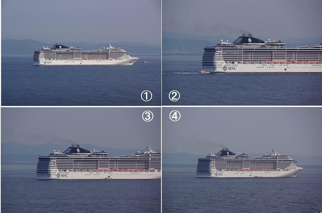 5月5日撮影 紀淡海峡から紀伊水道域に入ると大役を終えたパイロットが下船! 1-船首方向からPボートが近付いて 2-左舷側から船尾を回り込んで 3-舷側の開口部に接舷 4-パイロットが乗り移ると素早く離脱 1~4までわずか6分、海上で乗り移り! |