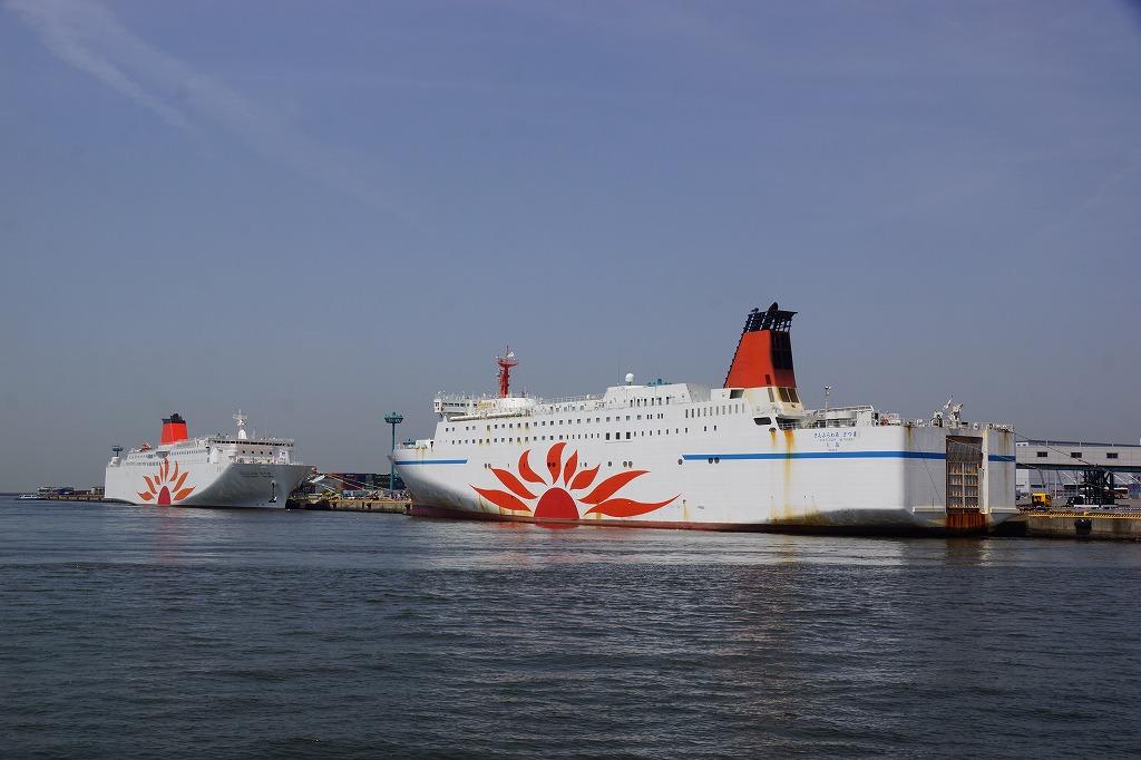 5月15日撮影 手前は旧の「さんふらわあ さつま1」 新旧の両船が並びましたが、この並びで撮れたのは最初で最後? |