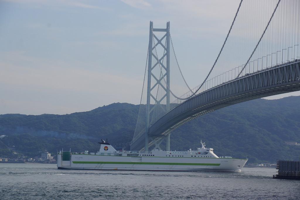 美しい写真を投稿頂きありがとうございます。明石大橋を太平洋航路のフェリーが通る姿は珍しいですね。