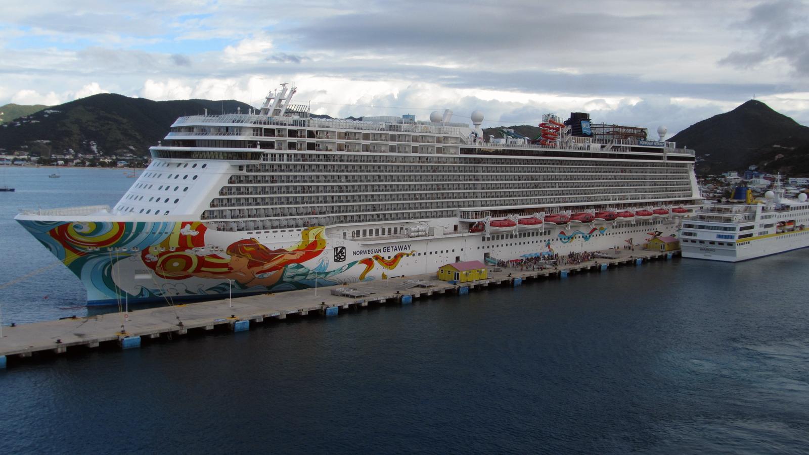 St. Maatenに停泊中のNorwegian Getawayです。派手な人魚のイラストが特徴です。 |