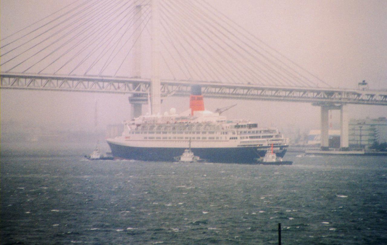 大嵐の中QE2が横浜港に入港した時の記録です。 |