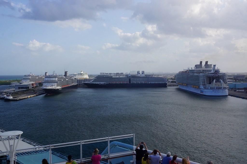2月24日撮影 この日は全部で8隻が順次出港、乗船の3番目にREGALPRINCESSが動いて後の5隻がやっと見えて来ました。 左の巨大船がHARMONYoftheSEAS、次にNieuwAMSTERDAM、次がKONINGSDAM、更に左にはNieuwSTATENDAM、その後方にはADNEVIUREoftheSEASが並んでいます。 |