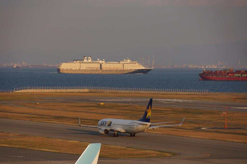 4月3日撮影 神戸港を出港して約45分、誘導路を走るスカイマーク機と大阪湾を南下する「WESTERDAM」のコラボ! |