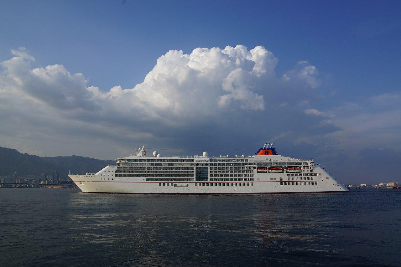5月3日撮影 神戸港北埠頭岸壁前を通過する、初入港の「EUROPA2」青空と白い雲と真っ白な船体の撮り合わせが絶妙! |