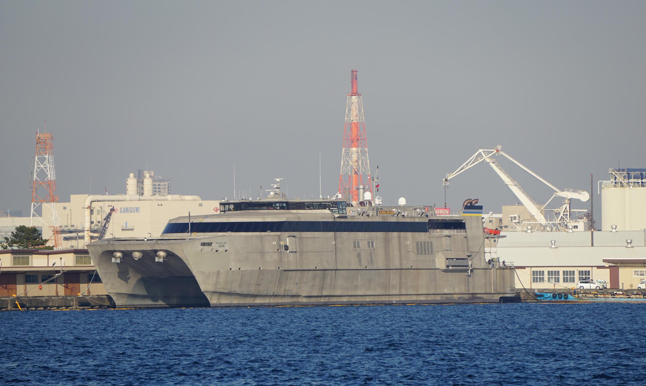 この船は元ハワイ諸島に就航していたフアカイという名前の高速フェリーで、現在は米軍によりGuamと改名されてアジア海域に配置されています。横浜港にもよく停泊しているカタマラン型のフェリーですが、船体色が鼠色と残念ながら平和で美しい客船のイメージとは程遠くなってしまったのが残念です。姉妹船はアラカイという名でカナダのベイフェリーズで活躍しています。
