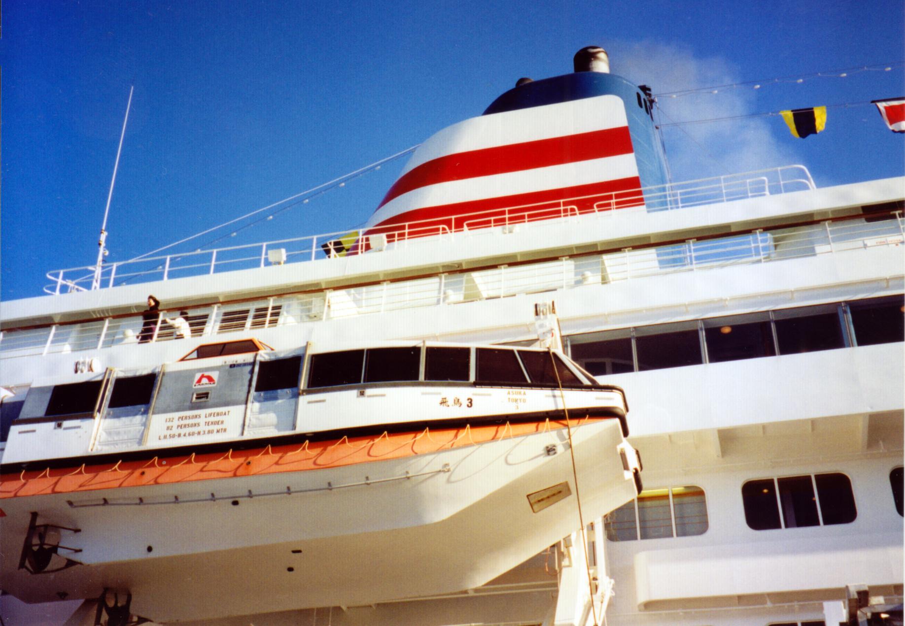 郵船クルーズ株式会社 (Yusen Cruise Co., Ltd.) 運航。 Built: 1991, IMO: 8913162, MMSI: n/a Gross tonnage: 28,717t, Length: 193.0m, Beams: 25.0m |
