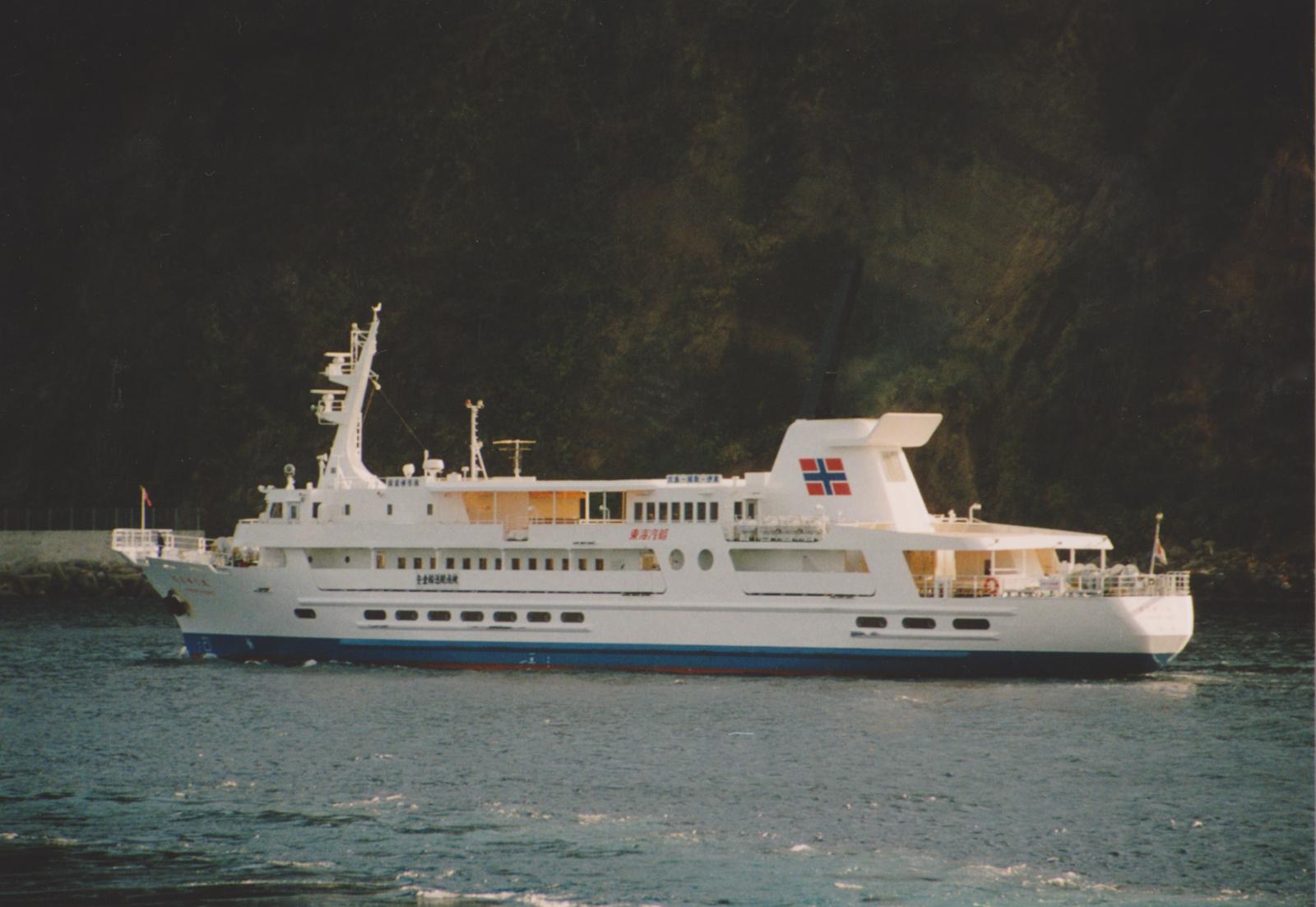 東海汽船株式会社 (Tokai Kisen Co., Ltd.) 運航。 Built: 1991, IMO: 9009205, MMSI: n/a Gross tonnage: 882t, Length: 67.5m, Beams: 10.5m |