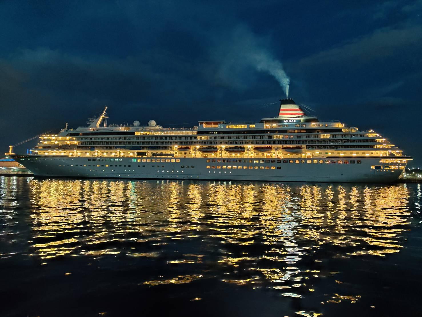 大桟橋にてクルーズ再開を待つ「飛鳥 II」。コロナが収束し、美しい海に出られる日が楽しみです。 |