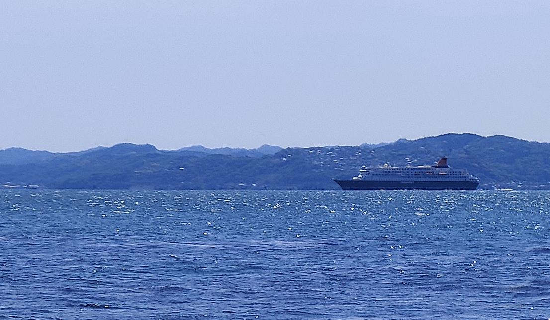 「にっぽん丸」は日本一周クルーズ中でしたが,横浜市の要請を受け,乗員乗客計約480人に新型コロナウイルスの感染者は確認できないもののクルーズを中止して大分県の港から引き返し,2021年5月3日,横浜港に帰港することになりました。こちらは横浜港に向け東京湾を北上しているシーンです。 |
