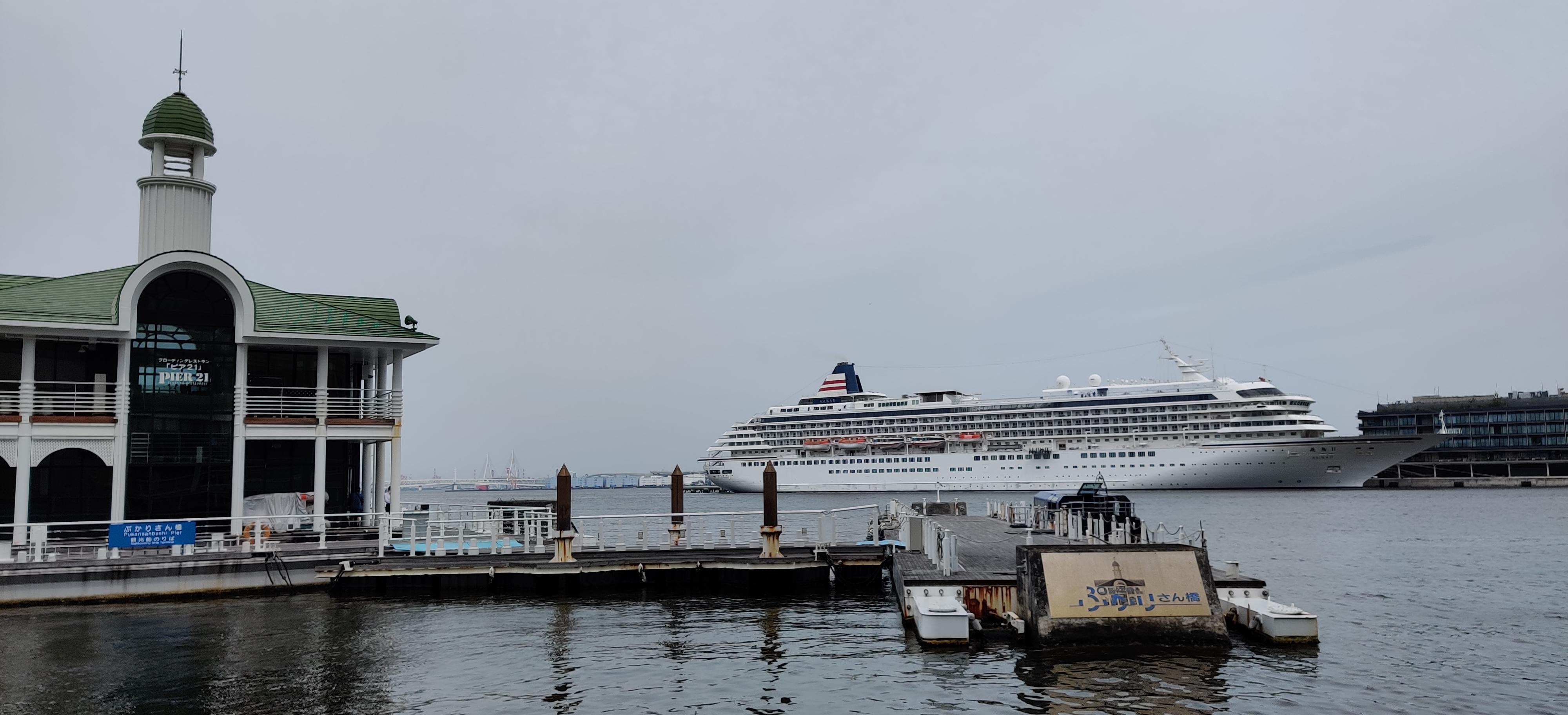 飛鳥IIが新港埠頭に着眼したのでぷかり桟橋と一緒に撮影してみました。 |