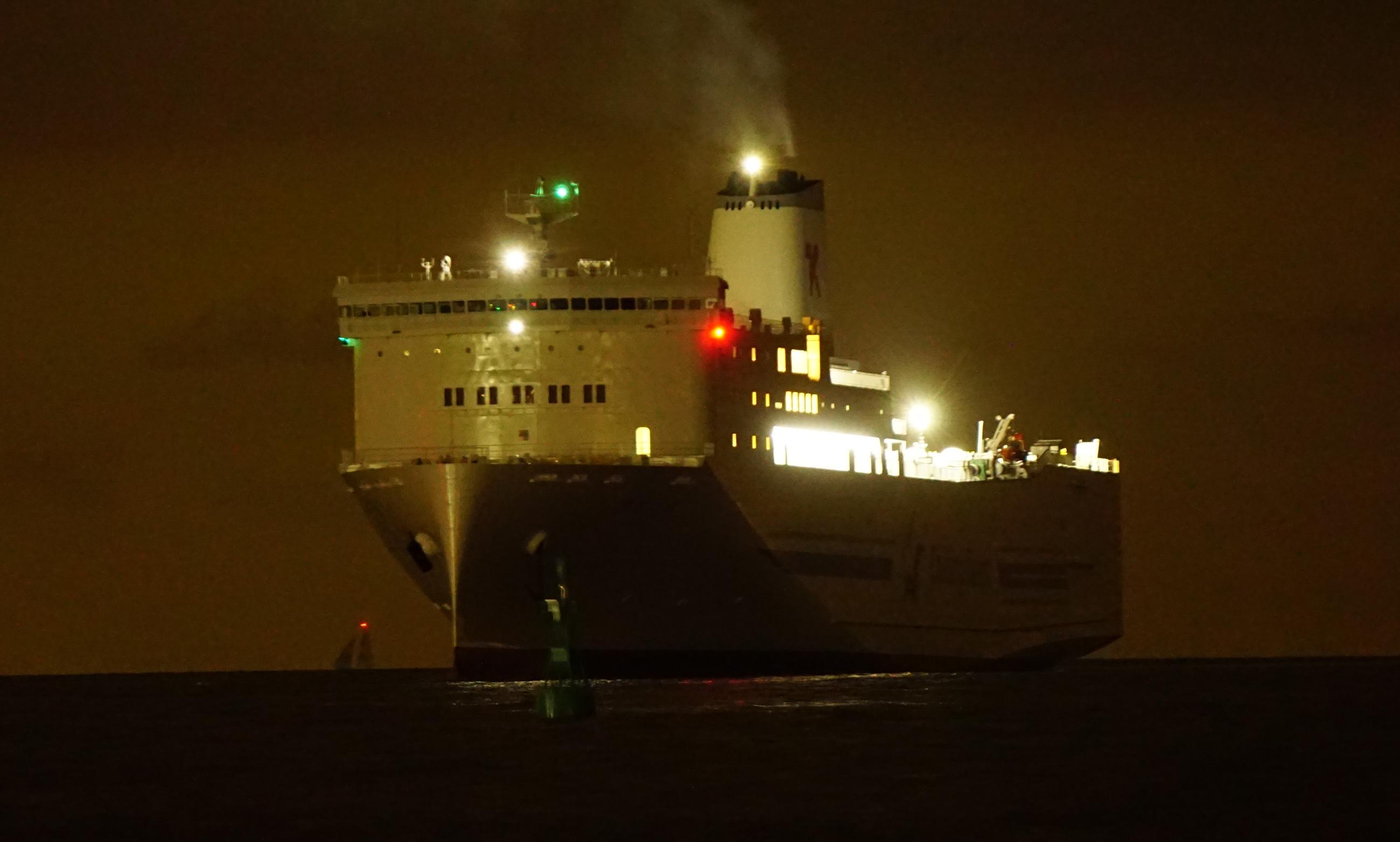 「それいゆ」が横須賀港に初入港しました。猿島の沖から船の光が少しずつ大きくなってきて全貌を現しました。 |