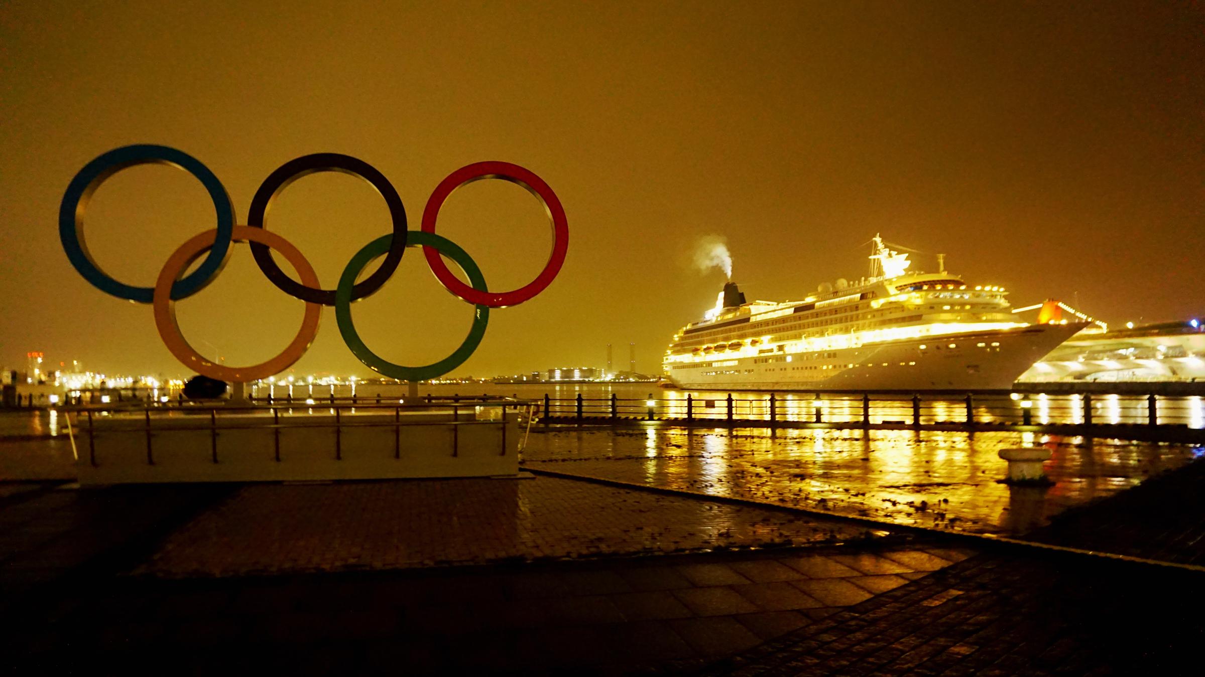 パンデミックの中での開催となってしまった東京オリンピックですが,横浜港にもオリンピックの象徴の五輪が飾られていました。 |