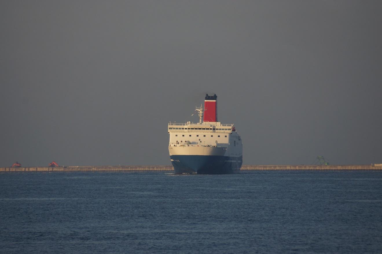こうしてみると正面はかなり丸い形をしているんですね。南港ではこれまでと同様,船首から搬出入作業をするのでしょうから正面は平たい必要があるのですね。そのような制限の中でもよく船容の整った船を建造してくれました。