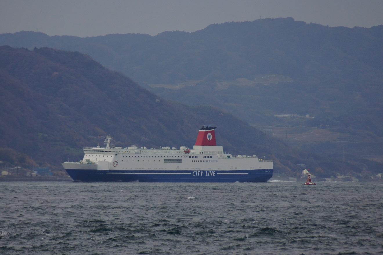 就航・処女航海の新門司発大阪南港行を撮りましたが、曇り空の天候不良で不本意な写真ですが。 |