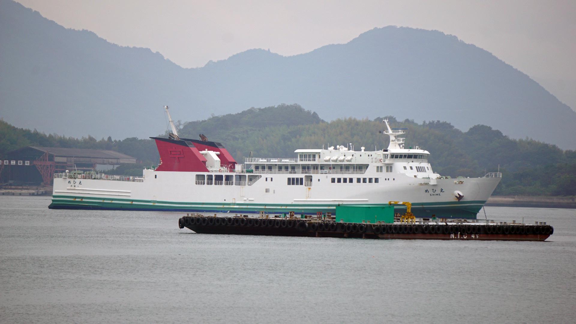 宇和島運輸の「えひめ」が内海造船沖合に停泊していました。ファンネルが赤く塗られていますが,これから佐渡汽船仕様に変更されるのかもしれません。 |