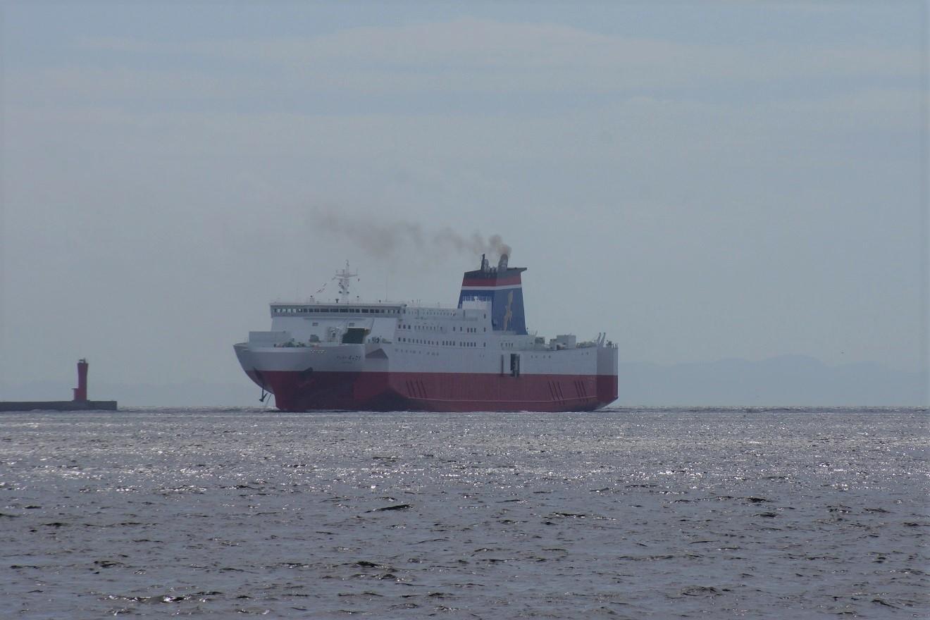 10月4日撮影 神戸港へ入港するギリギリ就航前?の「フェリーろっこう」は、19:10宮崎行が処女航海! |
