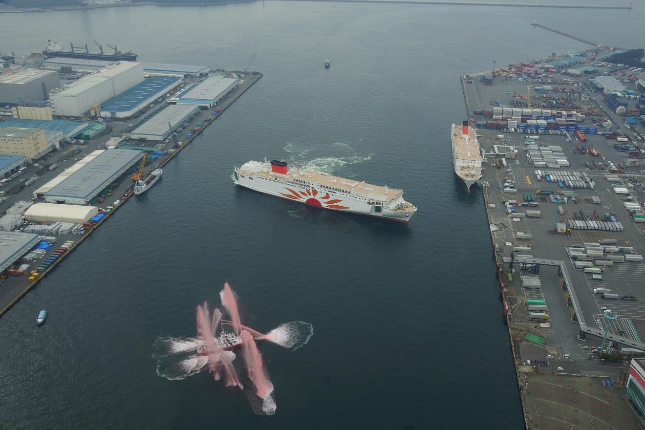 歓迎放水が華やかですね。太平洋航路より大きい瀬戸内海航路・・・時代の流れですね。素晴らしいフェリーがまた一つできました。昼間の航海時間が長いといいですね。