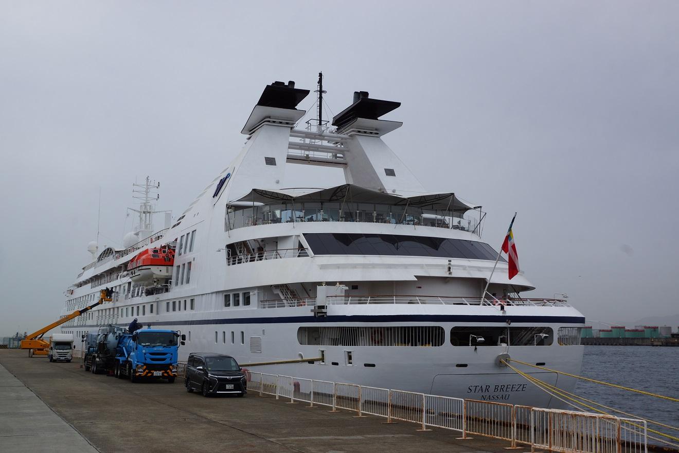 4月14日撮影 大阪港中央突堤は客船等には対応していませんので、乗客の皆さんは"えっ、貨物埠頭の隅っこに??"と思われたでしょうね?更に船見物、船撮りには立入、接近禁止岸壁ですから遠くから見る、撮るしか無い不都合な岸壁です。 |