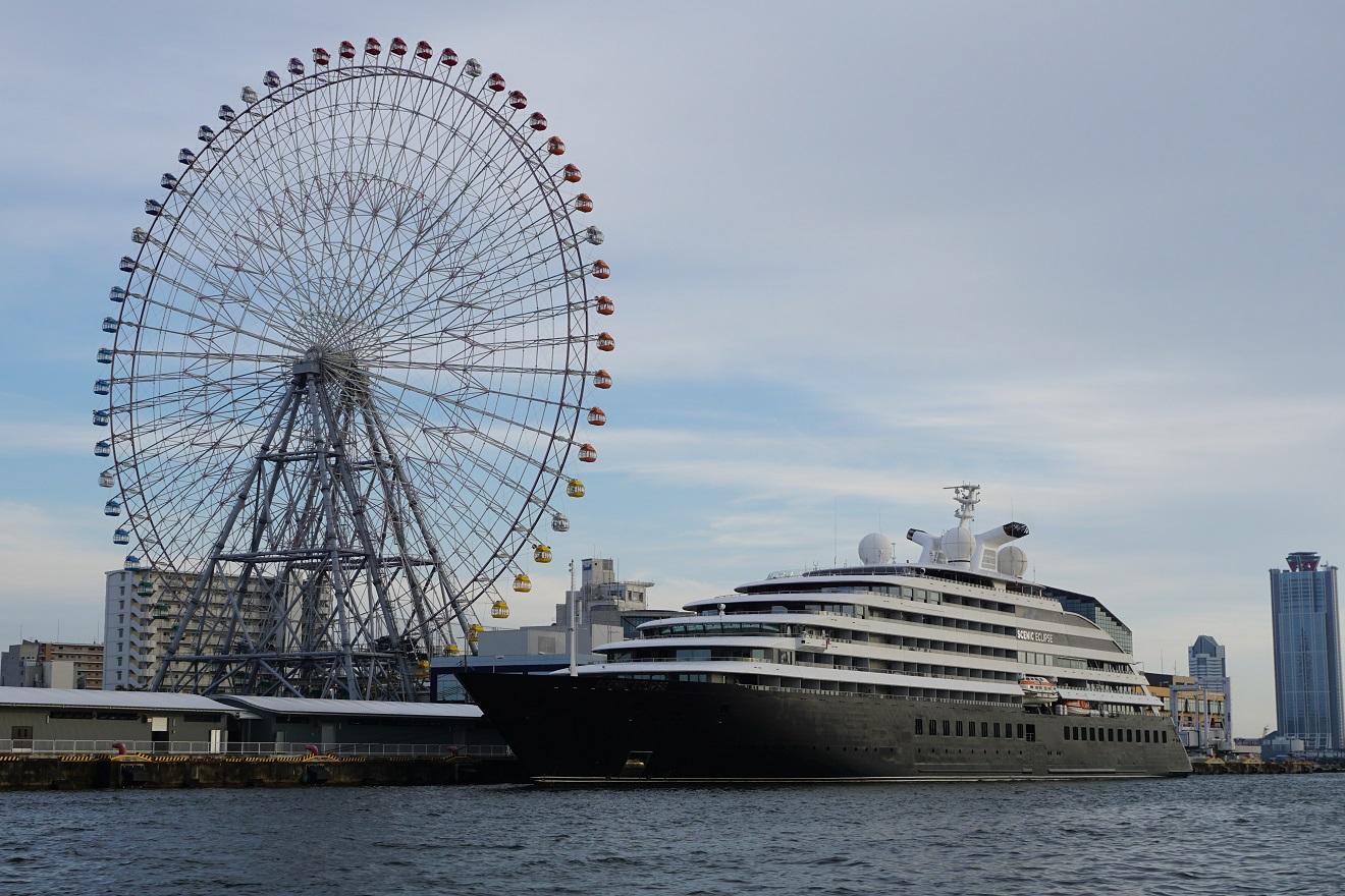 貴重な写真の投稿をありがとうございます。大阪港の典型的な風景ですね。それにしてもこのヨットは美しいですね。168メートルもあると思えないようなスタイリッシュな船ですね。